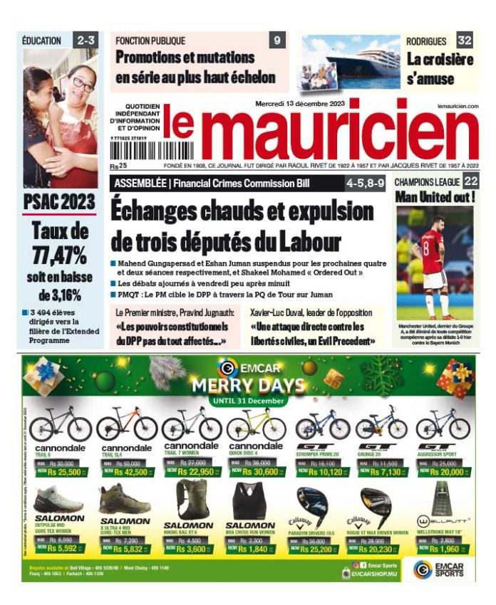 13 Déc 2023 08h29 Le Mauricien du 13 décembre 2023 Abonnement Le journal en continue Sodnac : Un octogénaire se fait voler sa chaîne de Rs 100 000 17 Déc 2025 17h00 Handicap : cap sur une stratégie et un plan d’action 2026–30 17 Déc 2025 17h00 Mont-Choisy : Attaqué par deux suspects à son domicile 17 Déc 2025 16h00 Affaire des coffres-forts : Contre-attaque de Ramgoolam avec une motion pour d’Abuse of Process 17 Déc 2025 15h00 Rivière du Rempart : Un policier brûlé après l’explosion d’une douche à gaz 17 Déc 2025 15h00 Le fils du cinéaste Rob Reiner inculpé pour l’assassinat de ses parents 17 Déc 2025 13h20 Gestion des marées noires : Maurice et le Japon misent sur une coopération environnementale consolidée 17 Déc 2025 12h38 Période festive : la force policière passe en « Surge Deployment » 17 Déc 2025 12h33 Loading... ACTUALITÉS Le fils du cinéaste Rob Reiner inculpé pour l’assassinat de ses parents Le fils du cinéaste américain Rob Reiner a été inculpé pour l'assassinat de ses parents retrouvés morts dimanche dans leur luxueux domicile de Los... 17 Déc 2025 13h20 Près de 7 000 diplômés sous le Free Tertiary Education Scheme 17 Déc 2025 10h43 Gestion des marées noires : Maurice et le Japon misent sur une coopération environnementale consolidée 17 Déc 2025 12h38 Admission en Grade 7 : inscriptions, révision et demande de correction 17 Déc 2025 11h30 Le fils du cinéaste Rob Reiner inculpé pour l’assassinat de ses parents Le fils du cinéaste américain Rob Reiner a été inculpé pour l'assassinat de ses parents retrouvés morts dimanche dans leur luxueux domicile de Los... 17 Déc 2025 13h20 si vous l'avez raté Affaire des coffres-forts : Contre-attaque de Ramgoolam avec une motion pour d’Abuse of Process 17 Déc 2025 15h00 National Foundation Certificate of Education : les résultats connus ce jeudi 18 décembre 17 Déc 2025 09h59 vidéos Réformes scolaires: l’ancienne ministre de l’éducation dénonce un système jugé élitiste et excluant 15 Déc 2025 16h07 Disque de l’année : les artistes dénoncent une participation… sans aucun paiement 11 Déc 2025 07h00 [LIVE] Assemblée Nationale : la PNQ du jour axée sur les dépenses électorales de décembre 2024 9 Déc 2025 09h09 Reconfiguration de l’avenue Père Laval : un projet de Rs 10 millions officiellement ouvert aux automobilistes 3 Déc 2025 15h26 Rapport du PRB : Navin Ramgoolam ne peut avancer de date pour la publication 2 Déc 2025 12h33