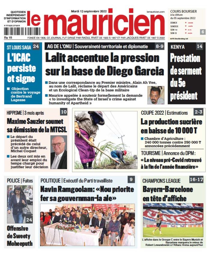 13 Sep 2022 08h37 Le mauricien du 13 septembre 2022 Abonnement Le journal en continue Nomination : Ashvin Lukeeram prend la tête de l’IBA 29 Déc 2025 09h00 2025, accidents mortels de la route : Un recul sensible 29 Déc 2025 08h11 Cyclone Grant s’intensifie : pas d’influence sur le temps à Maurice 29 Déc 2025 08h10 Météo : Le réveillon du 31 sous des averses éparses, accalmie attendue le Jour de l’An 29 Déc 2025 08h00 Messages de noël et du nouvel an : Une société à l’épreuve 29 Déc 2025 07h36 Tourism Authority : Une curieuse affaire de licence de bateaux 29 Déc 2025 07h00 La réouverture de la piscine de Mare d’Albert 29 Déc 2025 07h00 La météo du lundi 29 décembre 29 Déc 2025 05h30 Loading... ACTUALITÉS Messages de noël et du nouvel an : Une société à l’épreuve « Violence, drogue et fragilités sociales : le Président de la République, l'évêque de Maurice et l'évêque de Port-Louis lancent un appel unanime à... 29 Déc 2025 07h36 2025, accidents mortels de la route : Un recul sensible 29 Déc 2025 08h11 Cyclone Grant s’intensifie : pas d’influence sur le temps à Maurice 29 Déc 2025 08h10 La météo du lundi 29 décembre 29 Déc 2025 05h30 Messages de noël et du nouvel an : Une société à l’épreuve « Violence, drogue et fragilités sociales : le Président de la République, l'évêque de Maurice et l'évêque de Port-Louis lancent un appel unanime à... 29 Déc 2025 07h36 si vous l'avez raté Feux d’artifice : comment protéger nos animaux du stress des détonations ? 27 Déc 2025 14h50 Violence domestique : une mère et son fils de 7 ans agressés par l’ex-concubin 27 Déc 2025 14h06 vidéos Message du Président à la Nation – « Healthy Mauritius » : Vers une République de la courtoisie et du civisme 26 Déc 2025 09h02 Sécurité renforcée : 10 000 policiers mobilisés pour sécuriser l’île 22 Déc 2025 17h00 Bonus de fin d’année : comment éviter le piège du compte à sec dès la mi-janvier 21 Déc 2025 10h00 Réformes scolaires: l’ancienne ministre de l’éducation dénonce un système jugé élitiste et excluant 15 Déc 2025 16h07 Disque de l’année : les artistes dénoncent une participation… sans aucun paiement 11 Déc 2025 07h00