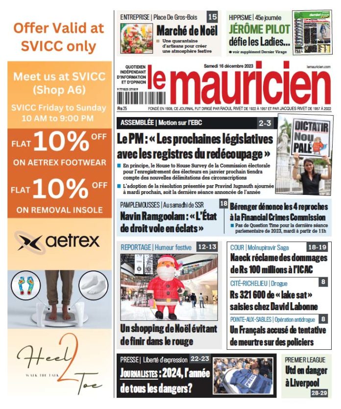 16 Déc 2023 06h00 Le Mauricien du 16 décembre 2023 Abonnement Le journal en continue Agaléga: un taux de réussite de 85,7% et des larmes de joie dans l’archipel 12 Déc 2025 19h00 Pensions : une hausse de 3,7 % pour plus de 325 000 bénéficiaires en janvier 2026 12 Déc 2025 17h15 Harcèlement en ligne : 1 414 incidents recensés officiellement depuis février 12 Déc 2025 17h00 Compensation Salariale : Rs 635 pour les salariés touchant jusqu’à Rs 50 000 12 Déc 2025 16h53 Lutte contre la drogue : 3 opérations et 14 kg de cannabis et de MDMA saisis en une journée 12 Déc 2025 16h00 Prison de Beau Bassin : Un détenu tente de se suicider 12 Déc 2025 15h00 Melrose – Meurtre à la prison de haute sécurité : La fouille au bloc Kestrel au cœur de l’enquête sur le cas d’Andy Selmour 12 Déc 2025 15h00 Réseau électrique: Coupures de courant programmées dans plusieurs régions du 12 au 14 décembre 12 Déc 2025 14h43 Loading... ACTUALITÉS Pensions : une hausse de 3,7 % pour plus de 325 000 bénéficiaires en janvier 2026 À partir du 1er janvier 2026, une hausse de 3,7 % sera appliquée à l’ensemble des pensions de base, incluant la pension de retraite,... 12 Déc 2025 17h15 Lutte contre la drogue : 3 opérations et 14 kg de cannabis et de MDMA saisis en une journée 12 Déc 2025 16h00 Agaléga: un taux de réussite de 85,7% et des larmes de joie dans l’archipel 12 Déc 2025 19h00 Harcèlement en ligne : 1 414 incidents recensés officiellement depuis février 12 Déc 2025 17h00 Pensions : une hausse de 3,7 % pour plus de 325 000 bénéficiaires en janvier 2026 À partir du 1er janvier 2026, une hausse de 3,7 % sera appliquée à l’ensemble des pensions de base, incluant la pension de retraite,... 12 Déc 2025 17h15 si vous l'avez raté Réseau électrique: Coupures de courant programmées dans plusieurs régions du 12 au 14 décembre 12 Déc 2025 14h43 Demande de Variation Order : Renganaden Padayachy essuie un deuxième refus de la Cour 12 Déc 2025 12h00 vidéos Disque de l’année : les artistes dénoncent une participation… sans aucun paiement 11 Déc 2025 07h00 [LIVE] Assemblée Nationale : la PNQ du jour axée sur les dépenses électorales de décembre 2024 9 Déc 2025 09h09 Reconfiguration de l’avenue Père Laval : un projet de Rs 10 millions officiellement ouvert aux automobilistes 3 Déc 2025 15h26 Rapport du PRB : Navin Ramgoolam ne peut avancer de date pour la publication 2 Déc 2025 12h33 [LIVE] PNQ : le rapport du PRB au cœur de la séance parlementaire de ce mardi 2 Déc 2025 10h16