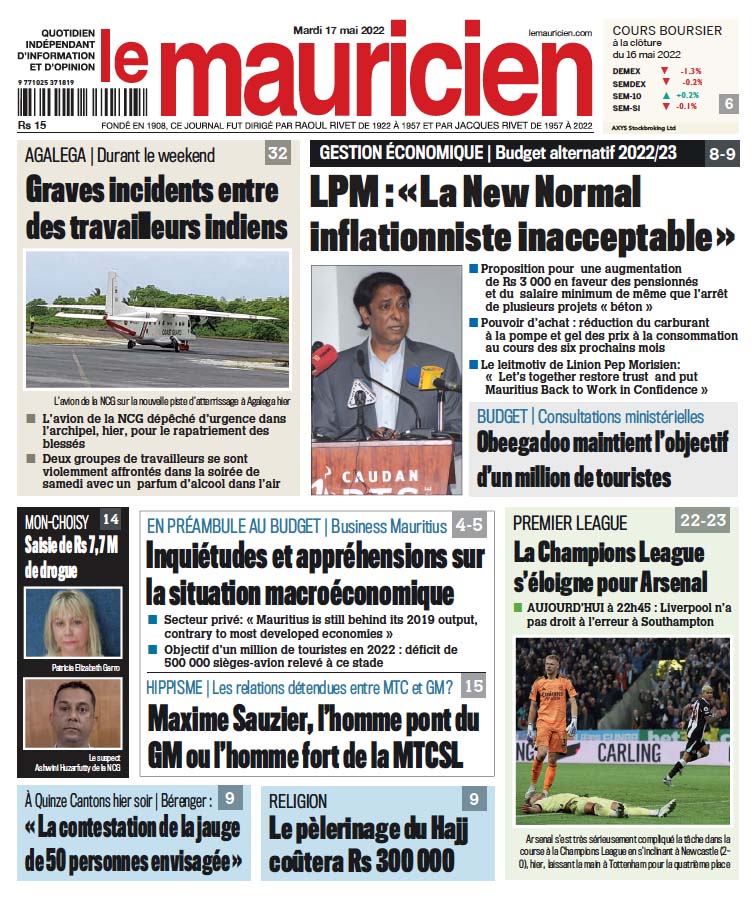 17 Mai 2022 08h34 Le mauricien du 17 mai 2022 Abonnement Le journal en continue Festival International Kreol – Richard Duval : « les 20 ans célébrés de manière grandiose en 2026 » 8 Déc 2025 20h00 Produits plastiques : ce qui est interdit, ce qui reste autorisé et les alternatives à Maurice 8 Déc 2025 19h00 L’AMM sur les plastiques : une transition qui progresse, structurée et équitable 8 Déc 2025 19h00 Cité La Cure : deux enfants abandonnés à la gare par leurs parents 8 Déc 2025 18h00 Urgences de fin d’année : semaine décisive pour le PRB et la compensation 8 Déc 2025 17h00 Profession juridique : Cérémonie officielle de nomination des 19 Senior Counsel et 12 Senior Attorneys 8 Déc 2025 16h35 Course de l’Unité : Paul Bérenger salue « un nouveau depart» dans la lutte antidrogue 8 Déc 2025 16h12 Centre commercial à Curepipe : deux ados blessés après l’effondrement d’un faux plafond 8 Déc 2025 15h34 Loading... ACTUALITÉS Course de l’Unité : Paul Bérenger salue « un nouveau depart» dans la lutte antidrogue Un nouveau départ est lancé dans la lutte contre la drogue "avec la relance de la National Agency for Drug Control". C'est ce qu'a... 8 Déc 2025 16h12 Produits plastiques : ce qui est interdit, ce qui reste autorisé et les alternatives à Maurice 8 Déc 2025 19h00 Profession juridique : Cérémonie officielle de nomination des 19 Senior Counsel et 12 Senior Attorneys 8 Déc 2025 16h35 Révision salariale – FCSOU : « Le PRB a déjà bouclé son rapport de Rs 8,5 milliards » 8 Déc 2025 11h00 Course de l’Unité : Paul Bérenger salue « un nouveau depart» dans la lutte antidrogue Un nouveau départ est lancé dans la lutte contre la drogue "avec la relance de la National Agency for Drug Control". C'est ce qu'a... 8 Déc 2025 16h12 si vous l'avez raté Cité La Cure : deux enfants abandonnés à la gare par leurs parents 8 Déc 2025 18h00 Urgences de fin d’année : semaine décisive pour le PRB et la compensation 8 Déc 2025 17h00 vidéos Reconfiguration de l’avenue Père Laval : un projet de Rs 10 millions officiellement ouvert aux automobilistes 3 Déc 2025 15h26 Rapport du PRB : Navin Ramgoolam ne peut avancer de date pour la publication 2 Déc 2025 12h33 [LIVE] PNQ : le rapport du PRB au cœur de la séance parlementaire de ce mardi 2 Déc 2025 10h16 Le « Syndrome du Coiffeur » : Quand le shampoing mène au risque d’AVC 24 Nov 2025 17h00 Après la crise interne au sein de l’Alliance du Changement : Bérenger déclare un « nouveau départ » 22 Nov 2025 12h37