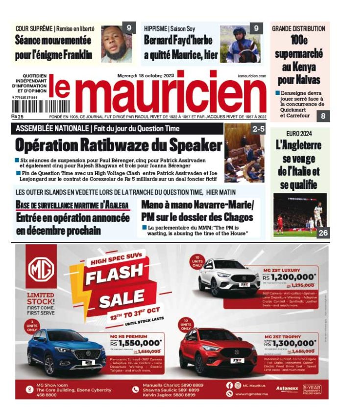 18 Oct 2023 08h48 Le Mauricien du 18 octobre 2023 Abonnement Le journal en continue Chagos Deal : la résistance en quête du coup de grâce 29 Déc 2025 17h00 Eyesore à grand-baie: Deux édifices abandonnés tombent en décrépitude 29 Déc 2025 16h00 L’Abécédaire de Week-End : En 8 consonnes et 2 voyelles, l’actualité commentée de 2025 29 Déc 2025 15h00 Gaza : l’enfer sur terre 29 Déc 2025 15h00 Cuillère de bois : La FMJ continue à ternir l’image du judo 29 Déc 2025 15h00 Indulgence et sentence 29 Déc 2025 15h00 La station météorologique de Vacoas a 100 ans Un siècle à scruter le ciel mauricien 29 Déc 2025 14h56 Hôpital Victoria : Un homme en ICU après une agression 29 Déc 2025 14h31 Loading... ACTUALITÉS La station météorologique de Vacoas a 100 ans Un siècle à scruter le ciel mauricien Depuis cent ans, les instruments dressés à Vacoas observent, mesurent et interprètent le ciel mauricien. Un siècle d’enregistrements, de veilles cycloniques, de relevés quotidiens... 29 Déc 2025 14h56 Hôpital Victoria : Un homme en ICU après une agression 29 Déc 2025 14h31 Mexique: au moins 13 morts et 98 blessés dans un déraillement 29 Déc 2025 13h00 Port Louis : Une septuagénaire tuée dans un accident de la route 29 Déc 2025 11h38 Cuillère de bois : La FMJ continue à ternir l’image du judo L’assemblée générale de la Fédération mauricienne de judo (FMJ) a décidé de ne pas accéder à la demande d’affiliation de Cassis Fraternel ! Cela,... 29 Déc 2025 15h00 si vous l'avez raté Cap Malheureux : Désordre et fugue au cœur du shelter Cap l’Espoir 29 Déc 2025 14h00 Messages de noël et du nouvel an : Une société à l’épreuve 29 Déc 2025 07h36 vidéos Message du Président à la Nation – « Healthy Mauritius » : Vers une République de la courtoisie et du civisme 26 Déc 2025 09h02 Sécurité renforcée : 10 000 policiers mobilisés pour sécuriser l’île 22 Déc 2025 17h00 Bonus de fin d’année : comment éviter le piège du compte à sec dès la mi-janvier 21 Déc 2025 10h00 Réformes scolaires: l’ancienne ministre de l’éducation dénonce un système jugé élitiste et excluant 15 Déc 2025 16h07 Disque de l’année : les artistes dénoncent une participation… sans aucun paiement 11 Déc 2025 07h00