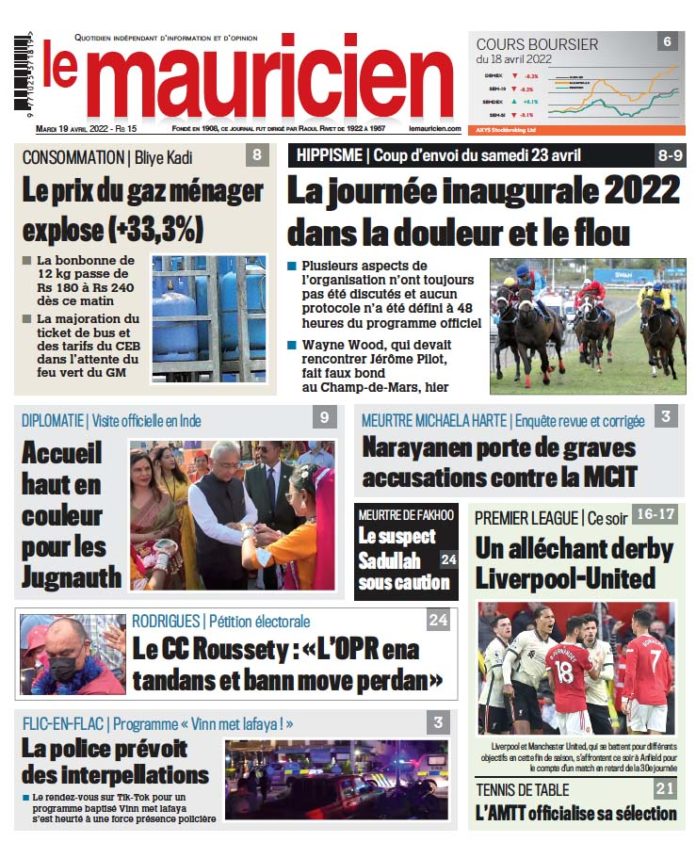 19 Avr 2022 08h23 Le mauricien du 19 avril 2022 Abonnement Le journal en continue Darren Rungasamy lynché en présence de policiers impuissants 26 Déc 2025 19h30 Rivière-du-Rempart : Un élément de la VIPSU succombe à des brûlures 26 Déc 2025 19h00 En Inde Dev Chooramun expose à la galerie AIFAC 26 Déc 2025 18h00 Salaires et conditions de services : PRB : La FPBOU exige un Omissions and Anomalies Committee indépendant 26 Déc 2025 18h00 « Panik dan baz » : Stéphane Rezannah signe une biographie monumentale sur l’épopée d’OSB 26 Déc 2025 16h57 Camping à la plage : Fini le dépôt de Rs 3000 26 Déc 2025 16h00 Japon: 14 blessés après une attaque au couteau et avec un liquide 26 Déc 2025 15h08 Décès de Daren Rungasamy en détention : trois arrestations pour « manslaughter » 26 Déc 2025 14h44 Loading... ACTUALITÉS Darren Rungasamy lynché en présence de policiers impuissants La police a arrêté trois des personnes qui ont lynché Darren Rungasamy (27 ans) ayant entraîné sa mort quelques jours plus tard. L’affaire débute... 26 Déc 2025 19h30 Salaires et conditions de services : PRB : La FPBOU exige un Omissions and Anomalies Committee indépendant 26 Déc 2025 18h00 Rivière-du-Rempart : Un élément de la VIPSU succombe à des brûlures 26 Déc 2025 19h00 « Panik dan baz » : Stéphane Rezannah signe une biographie monumentale sur l’épopée d’OSB 26 Déc 2025 16h57 Darren Rungasamy lynché en présence de policiers impuissants La police a arrêté trois des personnes qui ont lynché Darren Rungasamy (27 ans) ayant entraîné sa mort quelques jours plus tard. L’affaire débute... 26 Déc 2025 19h30 si vous l'avez raté Message du Président à la Nation – « Healthy Mauritius » : Vers une République de la courtoisie et du civisme 26 Déc 2025 09h02 Attachment Order de Rs 7,3 milliards : Le va-tout pour la caution de Mamy Ravatomanga 24 Déc 2025 11h00 vidéos Message du Président à la Nation – « Healthy Mauritius » : Vers une République de la courtoisie et du civisme 26 Déc 2025 09h02 Sécurité renforcée : 10 000 policiers mobilisés pour sécuriser l’île 22 Déc 2025 17h00 Bonus de fin d’année : comment éviter le piège du compte à sec dès la mi-janvier 21 Déc 2025 10h00 Réformes scolaires: l’ancienne ministre de l’éducation dénonce un système jugé élitiste et excluant 15 Déc 2025 16h07 Disque de l’année : les artistes dénoncent une participation… sans aucun paiement 11 Déc 2025 07h00