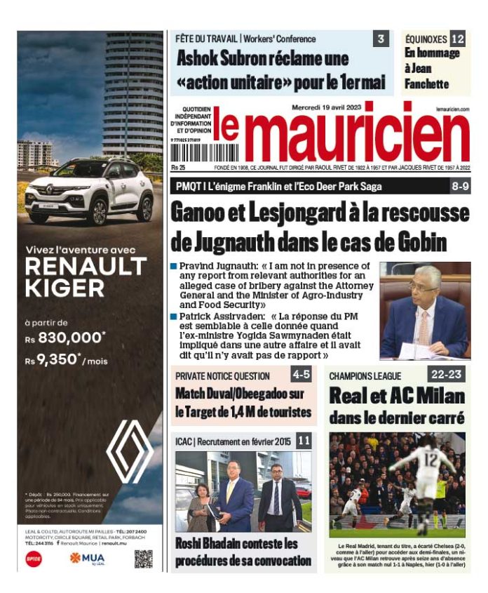 19 Avr 2023 08h19 Le Mauricien du 19 avril 2023 Abonnement Le journal en continue Vallée-des-prêtres : Des habitants pourchassent un revendeur de drogue 14 Déc 2025 09h00 Enquête – Opération Missie Moustas : L’ACP Deal prêt à tout dévoiler sur les équipements Pertsol 14 Déc 2025 09h00 À Roches Brunes : Un nouveau cas de chikungunya confirmé 14 Déc 2025 08h00 Melrose – Meurtre en zone de haute sécurité : L’ex-juge Lam Shang Leen enquêtera sur l’agression mortelle d’Andy Selmour 14 Déc 2025 08h00 Indonésie: le bilan des inondations dépasse les 1.000 morts 14 Déc 2025 07h30 Météo : les sorties en haute mer déconseillées 14 Déc 2025 07h16 Consultations tripartites – A partir de janvier 2026 : Compensation salariale de Rs 635 jusqu’à un maximu m de Rs 50 000 14 Déc 2025 07h00 Évacuation médicale en mer : deux membres d’équipage brûlés secourus au large de Port-Louis 13 Déc 2025 16h25 Loading... ACTUALITÉS À Roches Brunes : Un nouveau cas de chikungunya confirmé Un nouveau cas de chikungunya a été confirmé après des analyses effectuées au laboratoire de Candos. La patiente, une femme âgée de 68 ans,... 14 Déc 2025 08h00 Vallée-des-prêtres : Des habitants pourchassent un revendeur de drogue 14 Déc 2025 09h00 Indonésie: le bilan des inondations dépasse les 1.000 morts 14 Déc 2025 07h30 Météo : les sorties en haute mer déconseillées 14 Déc 2025 07h16 À Roches Brunes : Un nouveau cas de chikungunya confirmé Un nouveau cas de chikungunya a été confirmé après des analyses effectuées au laboratoire de Candos. La patiente, une femme âgée de 68 ans,... 14 Déc 2025 08h00 si vous l'avez raté Consultations tripartites – A partir de janvier 2026 : Compensation salariale de Rs 635 jusqu’à un maximu m de Rs 50 000 14 Déc 2025 07h00 Black Friday — Peach Payments Mauritius : +1365 % en valeur et + 377 % de transactions 13 Déc 2025 16h00 vidéos Disque de l’année : les artistes dénoncent une participation… sans aucun paiement 11 Déc 2025 07h00 [LIVE] Assemblée Nationale : la PNQ du jour axée sur les dépenses électorales de décembre 2024 9 Déc 2025 09h09 Reconfiguration de l’avenue Père Laval : un projet de Rs 10 millions officiellement ouvert aux automobilistes 3 Déc 2025 15h26 Rapport du PRB : Navin Ramgoolam ne peut avancer de date pour la publication 2 Déc 2025 12h33 [LIVE] PNQ : le rapport du PRB au cœur de la séance parlementaire de ce mardi 2 Déc 2025 10h16