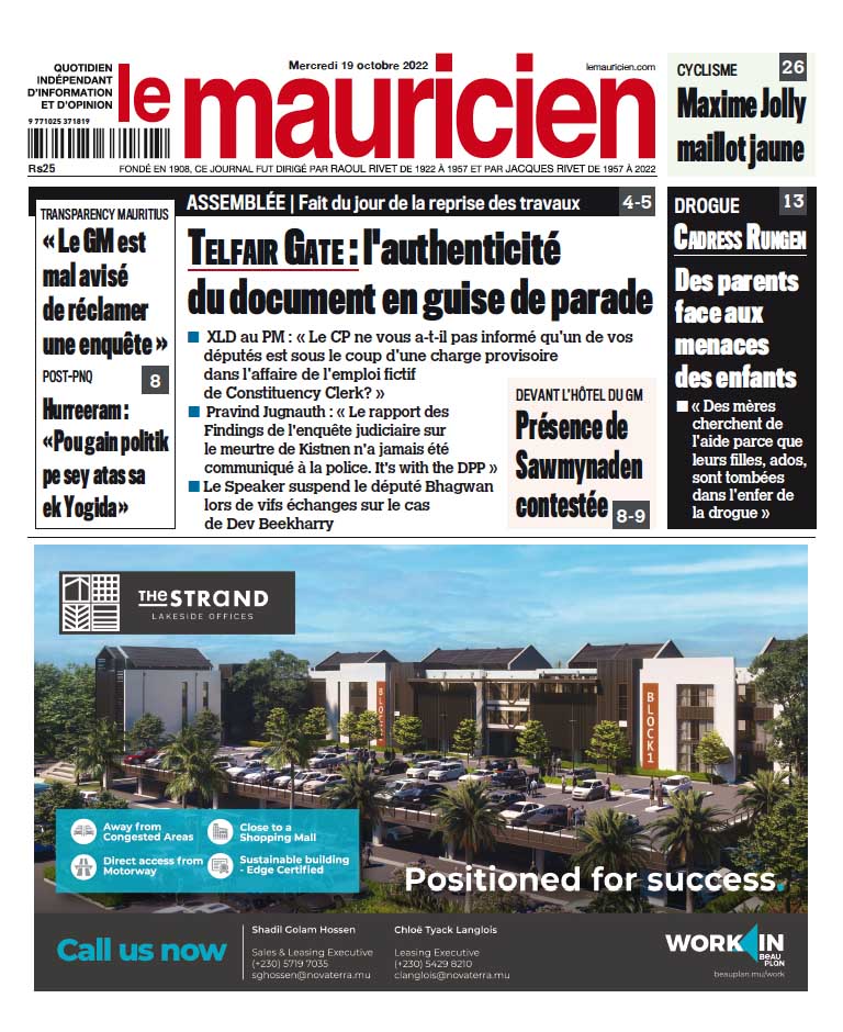19 Oct 2022 08h31 Le Mauricien du 19 octobre 2022 Abonnement Le journal en continue Après l’annonce du PM – Shanto : « Toute réforme au détriment des travailleurs aura des conséquences » 9 Jan 2026 17h00 SC : résultats publiés jeudi prochain 9 Jan 2026 17h00 Grade 7 : lettre de transfert non reçue, ce que vous devez savoir 9 Jan 2026 16h18 Souillac – Fraude alléguée : une employée d’une banque arrêtée 9 Jan 2026 16h17 Services essentiels : le Leader de l’Opposition réclame le rétablissement de la double allocation du dimanche 9 Jan 2026 15h51 Subsides : Stabilisation Fund: nouveaux prix en vigueur le 15 janvier 9 Jan 2026 15h00 Féminicide du 2 janvier : Une charge provisoire de meurtre logée contre Beltrami Kemayou 9 Jan 2026 12h00 Tempêtes Goretti et Elli: de fortes intempéries s’abattent sur une partie de l’Europe 9 Jan 2026 12h00 Loading... ACTUALITÉS Après l’annonce du PM – Shanto : « Toute réforme au détriment des travailleurs aura des conséquences » Le Premier ministre, Navin Ramgoolam, a annoncé dans son discours du Nouvel An que l'année 2026 sera celle de la réforme économique. La Fédération... 9 Jan 2026 17h00 Grade 7 : lettre de transfert non reçue, ce que vous devez savoir 9 Jan 2026 16h18 Souillac – Fraude alléguée : une employée d’une banque arrêtée 9 Jan 2026 16h17 Subsides : Stabilisation Fund: nouveaux prix en vigueur le 15 janvier 9 Jan 2026 15h00 Après l’annonce du PM – Shanto : « Toute réforme au détriment des travailleurs aura des conséquences » Le Premier ministre, Navin Ramgoolam, a annoncé dans son discours du Nouvel An que l'année 2026 sera celle de la réforme économique. La Fédération... 9 Jan 2026 17h00 si vous l'avez raté La météo du vendredi 9 janvier 9 Jan 2026 05h00 Casernes centrales : Coup de feu accidentel près du bureau du CP 8 Jan 2026 12h35 vidéos « Parfwa vremem », l’artiste ne gagne rien : Le sacre amer de Diyaune Francoeur 4 Jan 2026 12h48 Nouvel An 2026 : le PM Ramgoolam place l’année sous le signe de l’économie et de la consolidation démocratique 1 Jan 2026 22h13 Bilan 2025 : le ministre de la Jeunesse et des Sports fait le point sur les avancées et les défis 29 Déc 2025 19h04 Message du Président à la Nation – « Healthy Mauritius » : Vers une République de la courtoisie et du civisme 26 Déc 2025 09h02 Sécurité renforcée : 10 000 policiers mobilisés pour sécuriser l’île 22 Déc 2025 17h00