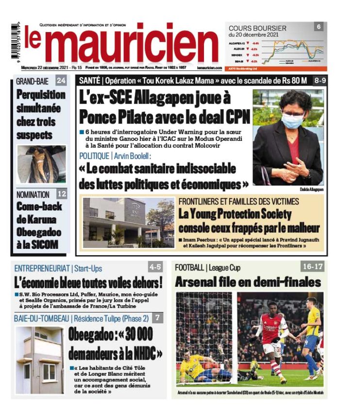 22 Déc 2021 08h40 Le Mauricien du 22 décembre 2021 Abonnement Le journal en continue Atelier Art Pour Tous Exposition annuelle : une soixantaine de tableaux pour clôturer l’année 31 Déc 2025 08h00 Éducation : cohorte de défis à relever entre désillusions et espoirs 31 Déc 2025 07h00 Gastronomie Le Chamarel Restaurant : menu aux couleurs du terroir 31 Déc 2025 07h00 La météo du mercredi 31 décembre 31 Déc 2025 05h00 Un avertissement de fortes pluies est en vigueur à Maurice 31 Déc 2025 00h32 Poudre d’Or : Quatre arrestations suite à un vol de moto et agressions contre des policiers 30 Déc 2025 20h00 Cour Suprême : Un terrain de feu Siddick Chady sera vendu à la barre 30 Déc 2025 19h00 Période festive : Survivre à l’« entre-deux-fêtes » 30 Déc 2025 18h00 Loading... ACTUALITÉS Gastronomie Le Chamarel Restaurant : menu aux couleurs du terroir Croquez dans le terroir pour les festivités ! Pour célébrer comme il se doit les fêtes de fin d’année, le Chamarel Restaurant dévoile deux... 31 Déc 2025 07h00 Cour Suprême : Un terrain de feu Siddick Chady sera vendu à la barre 30 Déc 2025 19h00 La météo du mercredi 31 décembre 31 Déc 2025 05h00 Un avertissement de fortes pluies est en vigueur à Maurice 31 Déc 2025 00h32 Gastronomie Le Chamarel Restaurant : menu aux couleurs du terroir Croquez dans le terroir pour les festivités ! Pour célébrer comme il se doit les fêtes de fin d’année, le Chamarel Restaurant dévoile deux... 31 Déc 2025 07h00 si vous l'avez raté MT Data Centre – Le ministre Ramtohul : « Répondre aux besoins des cinq prochaines années » 30 Déc 2025 17h00 Atelier Art Pour Tous Exposition annuelle : une soixantaine de tableaux pour clôturer l’année 31 Déc 2025 08h00 vidéos Bilan 2025 : le ministre de la Jeunesse et des Sports fait le point sur les avancées et les défis 29 Déc 2025 19h04 Message du Président à la Nation – « Healthy Mauritius » : Vers une République de la courtoisie et du civisme 26 Déc 2025 09h02 Sécurité renforcée : 10 000 policiers mobilisés pour sécuriser l’île 22 Déc 2025 17h00 Bonus de fin d’année : comment éviter le piège du compte à sec dès la mi-janvier 21 Déc 2025 10h00 Réformes scolaires: l’ancienne ministre de l’éducation dénonce un système jugé élitiste et excluant 15 Déc 2025 16h07