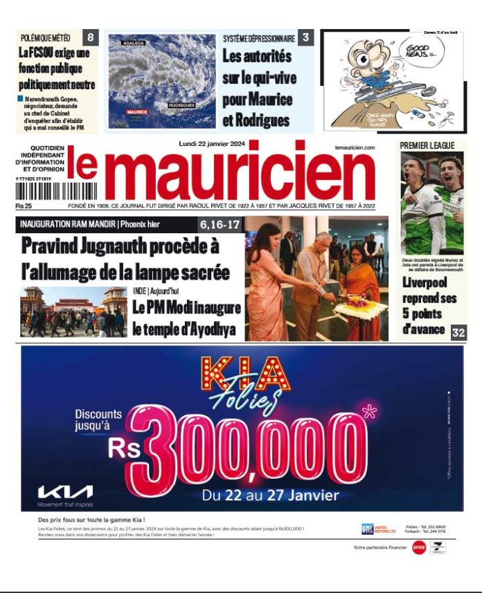 22 Jan 2024 08h25 Le Mauricien du 22 janvier 2024 Abonnement Le journal en continue Météo : la dépression tropicale Grant se rapproche de St Brandon 3 Jan 2026 18h56 Iran: Khamenei estime « justes » les revendications économiques des manifestants 3 Jan 2026 16h30 Port-Louis : une plainte pour violence domestique après la découverte d’une seringue dans les jouets des enfants 3 Jan 2026 15h52 Trump affirme que Maduro a été « capturé et évacué » du Venezuela 3 Jan 2026 14h30 Pont de Beau Champs : changements de circulation à Bel Ombre dès le 5 janvier 3 Jan 2026 14h00 Mahashivratree 2026 : Le ministère impose des normes strictes pour les Kanwars 3 Jan 2026 14h00 Explosions : le Venezuela « dénonce la très grave agression militaire » des Etats-Unis 3 Jan 2026 12h32 Rétrospective : 2025, l’année des promesses contrariées, des comptes à rendre et une FCC à la fois toute-puissante et sous pression 3 Jan 2026 12h00 Loading... ACTUALITÉS Météo : la dépression tropicale Grant se rapproche de St Brandon La dépression tropicale Grant continue de se rapprocher de St Brandon, où une dégradation progressive du temps est attendue. À 16h00 ce samedi, le... 3 Jan 2026 18h56 Iran: Khamenei estime « justes » les revendications économiques des manifestants 3 Jan 2026 16h30 Port-Louis : une plainte pour violence domestique après la découverte d’une seringue dans les jouets des enfants 3 Jan 2026 15h52 Trump affirme que Maduro a été « capturé et évacué » du Venezuela 3 Jan 2026 14h30 Météo : la dépression tropicale Grant se rapproche de St Brandon La dépression tropicale Grant continue de se rapprocher de St Brandon, où une dégradation progressive du temps est attendue. À 16h00 ce samedi, le... 3 Jan 2026 18h56 si vous l'avez raté Rétrospective : 2025, l’année des promesses contrariées, des comptes à rendre et une FCC à la fois toute-puissante et sous pression 3 Jan 2026 12h00 Suisse: après l’incendie du bar de Crans-Montana, identifier les victimes, trouver les causes 3 Jan 2026 08h43 vidéos Nouvel An 2026 : le PM Ramgoolam place l’année sous le signe de l’économie et de la consolidation démocratique 1 Jan 2026 22h13 Bilan 2025 : le ministre de la Jeunesse et des Sports fait le point sur les avancées et les défis 29 Déc 2025 19h04 Message du Président à la Nation – « Healthy Mauritius » : Vers une République de la courtoisie et du civisme 26 Déc 2025 09h02 Sécurité renforcée : 10 000 policiers mobilisés pour sécuriser l’île 22 Déc 2025 17h00 Bonus de fin d’année : comment éviter le piège du compte à sec dès la mi-janvier 21 Déc 2025 10h00