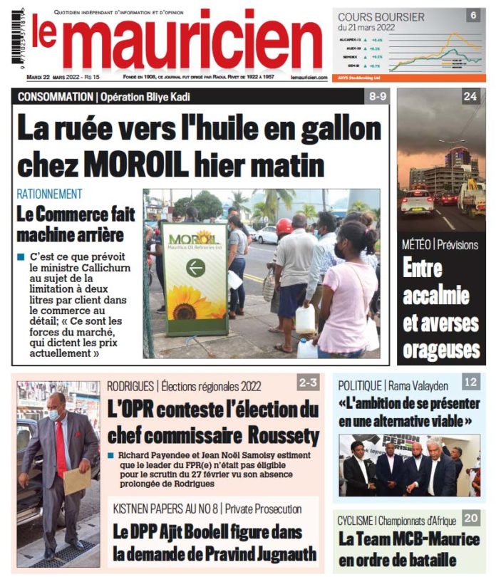 22 Mar 2022 08h32 Le Mauricien du 22 mars 2022 Abonnement Le journal en continue Darren Rungasamy lynché en présence de policiers impuissants 26 Déc 2025 19h30 Rivière-du-Rempart : Un élément de la VIPSU succombe à des brûlures 26 Déc 2025 19h00 En Inde Dev Chooramun expose à la galerie AIFAC 26 Déc 2025 18h00 Salaires et conditions de services : PRB : La FPBOU exige un Omissions and Anomalies Committee indépendant 26 Déc 2025 18h00 « Panik dan baz » : Stéphane Rezannah signe une biographie monumentale sur l’épopée d’OSB 26 Déc 2025 16h57 Camping à la plage : Fini le dépôt de Rs 3000 26 Déc 2025 16h00 Japon: 14 blessés après une attaque au couteau et avec un liquide 26 Déc 2025 15h08 Décès de Daren Rungasamy en détention : trois arrestations pour « manslaughter » 26 Déc 2025 14h44 Loading... ACTUALITÉS Darren Rungasamy lynché en présence de policiers impuissants La police a arrêté trois des personnes qui ont lynché Darren Rungasamy (27 ans) ayant entraîné sa mort quelques jours plus tard. L’affaire débute... 26 Déc 2025 19h30 Salaires et conditions de services : PRB : La FPBOU exige un Omissions and Anomalies Committee indépendant 26 Déc 2025 18h00 Rivière-du-Rempart : Un élément de la VIPSU succombe à des brûlures 26 Déc 2025 19h00 « Panik dan baz » : Stéphane Rezannah signe une biographie monumentale sur l’épopée d’OSB 26 Déc 2025 16h57 Darren Rungasamy lynché en présence de policiers impuissants La police a arrêté trois des personnes qui ont lynché Darren Rungasamy (27 ans) ayant entraîné sa mort quelques jours plus tard. L’affaire débute... 26 Déc 2025 19h30 si vous l'avez raté Message du Président à la Nation – « Healthy Mauritius » : Vers une République de la courtoisie et du civisme 26 Déc 2025 09h02 Attachment Order de Rs 7,3 milliards : Le va-tout pour la caution de Mamy Ravatomanga 24 Déc 2025 11h00 vidéos Message du Président à la Nation – « Healthy Mauritius » : Vers une République de la courtoisie et du civisme 26 Déc 2025 09h02 Sécurité renforcée : 10 000 policiers mobilisés pour sécuriser l’île 22 Déc 2025 17h00 Bonus de fin d’année : comment éviter le piège du compte à sec dès la mi-janvier 21 Déc 2025 10h00 Réformes scolaires: l’ancienne ministre de l’éducation dénonce un système jugé élitiste et excluant 15 Déc 2025 16h07 Disque de l’année : les artistes dénoncent une participation… sans aucun paiement 11 Déc 2025 07h00