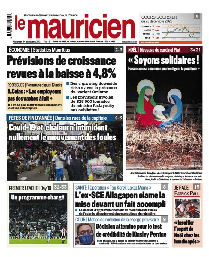 24 Déc 2021 08h22 Le Mauricien du 24 décembre 2021 Abonnement Le journal en continue Eyesore à grand-baie: Deux édifices abandonnés tombent en décrépitude 29 Déc 2025 16h00 L’Abécédaire de Week-End : En 8 consonnes et 2 voyelles, l’actualité commentée de 2025 29 Déc 2025 15h00 Gaza : l’enfer sur terre 29 Déc 2025 15h00 Cuillère de bois : La FMJ continue à ternir l’image du judo 29 Déc 2025 15h00 Indulgence et sentence 29 Déc 2025 15h00 La station météorologique de Vacoas a 100 ans Un siècle à scruter le ciel mauricien 29 Déc 2025 14h56 Hôpital Victoria : Un homme en ICU après une agression 29 Déc 2025 14h31 Cap Malheureux : Désordre et fugue au cœur du shelter Cap l’Espoir 29 Déc 2025 14h00 Loading... ACTUALITÉS La station météorologique de Vacoas a 100 ans Un siècle à scruter le ciel mauricien Depuis cent ans, les instruments dressés à Vacoas observent, mesurent et interprètent le ciel mauricien. Un siècle d’enregistrements, de veilles cycloniques, de relevés quotidiens... 29 Déc 2025 14h56 Hôpital Victoria : Un homme en ICU après une agression 29 Déc 2025 14h31 Mexique: au moins 13 morts et 98 blessés dans un déraillement 29 Déc 2025 13h00 Port Louis : Une septuagénaire tuée dans un accident de la route 29 Déc 2025 11h38 Cuillère de bois : La FMJ continue à ternir l’image du judo L’assemblée générale de la Fédération mauricienne de judo (FMJ) a décidé de ne pas accéder à la demande d’affiliation de Cassis Fraternel ! Cela,... 29 Déc 2025 15h00 si vous l'avez raté Messages de noël et du nouvel an : Une société à l’épreuve 29 Déc 2025 07h36 2025, accidents mortels de la route : Un recul sensible 29 Déc 2025 08h11 vidéos Message du Président à la Nation – « Healthy Mauritius » : Vers une République de la courtoisie et du civisme 26 Déc 2025 09h02 Sécurité renforcée : 10 000 policiers mobilisés pour sécuriser l’île 22 Déc 2025 17h00 Bonus de fin d’année : comment éviter le piège du compte à sec dès la mi-janvier 21 Déc 2025 10h00 Réformes scolaires: l’ancienne ministre de l’éducation dénonce un système jugé élitiste et excluant 15 Déc 2025 16h07 Disque de l’année : les artistes dénoncent une participation… sans aucun paiement 11 Déc 2025 07h00