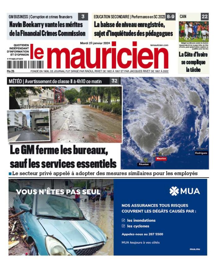 23 Jan 2024 08h34 Le Mauricien du 23 janvier 2023 Abonnement Le journal en continue Agaléga: un taux de réussite de 85,7% et des larmes de joie dans l’archipel 12 Déc 2025 19h00 Pensions : une hausse de 3,7 % pour plus de 325 000 bénéficiaires en janvier 2026 12 Déc 2025 17h15 Harcèlement en ligne : 1 414 incidents recensés officiellement depuis février 12 Déc 2025 17h00 Compensation Salariale : Rs 635 pour les salariés touchant jusqu’à Rs 50 000 12 Déc 2025 16h53 Lutte contre la drogue : 3 opérations et 14 kg de cannabis et de MDMA saisis en une journée 12 Déc 2025 16h00 Prison de Beau Bassin : Un détenu tente de se suicider 12 Déc 2025 15h00 Melrose – Meurtre à la prison de haute sécurité : La fouille au bloc Kestrel au cœur de l’enquête sur le cas d’Andy Selmour 12 Déc 2025 15h00 Réseau électrique: Coupures de courant programmées dans plusieurs régions du 12 au 14 décembre 12 Déc 2025 14h43 Loading... ACTUALITÉS Pensions : une hausse de 3,7 % pour plus de 325 000 bénéficiaires en janvier 2026 À partir du 1er janvier 2026, une hausse de 3,7 % sera appliquée à l’ensemble des pensions de base, incluant la pension de retraite,... 12 Déc 2025 17h15 Lutte contre la drogue : 3 opérations et 14 kg de cannabis et de MDMA saisis en une journée 12 Déc 2025 16h00 Agaléga: un taux de réussite de 85,7% et des larmes de joie dans l’archipel 12 Déc 2025 19h00 Harcèlement en ligne : 1 414 incidents recensés officiellement depuis février 12 Déc 2025 17h00 Pensions : une hausse de 3,7 % pour plus de 325 000 bénéficiaires en janvier 2026 À partir du 1er janvier 2026, une hausse de 3,7 % sera appliquée à l’ensemble des pensions de base, incluant la pension de retraite,... 12 Déc 2025 17h15 si vous l'avez raté Réseau électrique: Coupures de courant programmées dans plusieurs régions du 12 au 14 décembre 12 Déc 2025 14h43 Demande de Variation Order : Renganaden Padayachy essuie un deuxième refus de la Cour 12 Déc 2025 12h00 vidéos Disque de l’année : les artistes dénoncent une participation… sans aucun paiement 11 Déc 2025 07h00 [LIVE] Assemblée Nationale : la PNQ du jour axée sur les dépenses électorales de décembre 2024 9 Déc 2025 09h09 Reconfiguration de l’avenue Père Laval : un projet de Rs 10 millions officiellement ouvert aux automobilistes 3 Déc 2025 15h26 Rapport du PRB : Navin Ramgoolam ne peut avancer de date pour la publication 2 Déc 2025 12h33 [LIVE] PNQ : le rapport du PRB au cœur de la séance parlementaire de ce mardi 2 Déc 2025 10h16