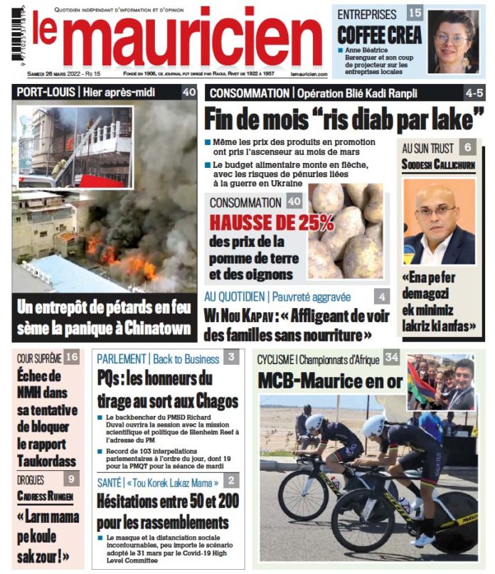 25 Mar 2022 20h59 Le mauricien du 26 mars 2022 Abonnement Le journal en continue Prison de Beau Bassin : Un détenu tente de se suicider 12 Déc 2025 15h00 Melrose – Meurtre à la prison de haute sécurité : La fouille au bloc Kestrel au cœur de l’enquête sur le cas d’Andy Selmour 12 Déc 2025 15h00 Réseau électrique: Coupures de courant programmées dans plusieurs régions du 12 au 14 décembre 12 Déc 2025 14h43 Un avertissement de fortes pluies est en vigueur à Maurice 12 Déc 2025 12h51 Demande de Variation Order : Renganaden Padayachy essuie un deuxième refus de la Cour 12 Déc 2025 12h00 Consultations Tripartites – 2e round : Compensation : montant cité Rs 700 avec Cut-off entre Rs 20 000 et Rs 50 000 12 Déc 2025 12h00 Airbags défectueux : le ministère alerte les propriétaires de BMW 12 Déc 2025 11h33 Japon: séisme de magnitude 6,7 au nord du pays, fin de l’alerte au tsunami. 12 Déc 2025 10h59 Loading... ACTUALITÉS Réseau électrique: Coupures de courant programmées dans plusieurs régions du 12 au 14 décembre Le Central Electricity Board procédera à des coupures de courant programmées dans plusieurs régions de Île entre le 12 et le 14 décembre 2025... 12 Déc 2025 14h43 Un avertissement de fortes pluies est en vigueur à Maurice 12 Déc 2025 12h51 Demande de Variation Order : Renganaden Padayachy essuie un deuxième refus de la Cour 12 Déc 2025 12h00 Melrose – Meurtre à la prison de haute sécurité : La fouille au bloc Kestrel au cœur de l’enquête sur le cas d’Andy Selmour 12 Déc 2025 15h00 Réseau électrique: Coupures de courant programmées dans plusieurs régions du 12 au 14 décembre Le Central Electricity Board procédera à des coupures de courant programmées dans plusieurs régions de Île entre le 12 et le 14 décembre 2025... 12 Déc 2025 14h43 si vous l'avez raté ICTA : écoutes téléphoniques : l’ACP Deal, maillon fort du réseau Moustas Leaks 12 Déc 2025 07h00 Autorisation de voyage refusée pour Renganaden Padayachy : la police évoque un risque de fuite 12 Déc 2025 08h49 vidéos Disque de l’année : les artistes dénoncent une participation… sans aucun paiement 11 Déc 2025 07h00 [LIVE] Assemblée Nationale : la PNQ du jour axée sur les dépenses électorales de décembre 2024 9 Déc 2025 09h09 Reconfiguration de l’avenue Père Laval : un projet de Rs 10 millions officiellement ouvert aux automobilistes 3 Déc 2025 15h26 Rapport du PRB : Navin Ramgoolam ne peut avancer de date pour la publication 2 Déc 2025 12h33 [LIVE] PNQ : le rapport du PRB au cœur de la séance parlementaire de ce mardi 2 Déc 2025 10h16