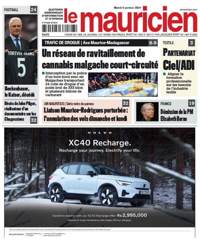 9 Jan 2024 08h18 Le Mauricien du 9 janvier 2023 Abonnement Le journal en continue Agaléga: un taux de réussite de 85,7% et des larmes de joie dans l’archipel 12 Déc 2025 19h00 Pensions : une hausse de 3,7 % pour plus de 325 000 bénéficiaires en janvier 2026 12 Déc 2025 17h15 Harcèlement en ligne : 1 414 incidents recensés officiellement depuis février 12 Déc 2025 17h00 Compensation Salariale : Rs 635 pour les salariés touchant jusqu’à Rs 50 000 12 Déc 2025 16h53 Lutte contre la drogue : 3 opérations et 14 kg de cannabis et de MDMA saisis en une journée 12 Déc 2025 16h00 Prison de Beau Bassin : Un détenu tente de se suicider 12 Déc 2025 15h00 Melrose – Meurtre à la prison de haute sécurité : La fouille au bloc Kestrel au cœur de l’enquête sur le cas d’Andy Selmour 12 Déc 2025 15h00 Réseau électrique: Coupures de courant programmées dans plusieurs régions du 12 au 14 décembre 12 Déc 2025 14h43 Loading... ACTUALITÉS Pensions : une hausse de 3,7 % pour plus de 325 000 bénéficiaires en janvier 2026 À partir du 1er janvier 2026, une hausse de 3,7 % sera appliquée à l’ensemble des pensions de base, incluant la pension de retraite,... 12 Déc 2025 17h15 Lutte contre la drogue : 3 opérations et 14 kg de cannabis et de MDMA saisis en une journée 12 Déc 2025 16h00 Agaléga: un taux de réussite de 85,7% et des larmes de joie dans l’archipel 12 Déc 2025 19h00 Harcèlement en ligne : 1 414 incidents recensés officiellement depuis février 12 Déc 2025 17h00 Pensions : une hausse de 3,7 % pour plus de 325 000 bénéficiaires en janvier 2026 À partir du 1er janvier 2026, une hausse de 3,7 % sera appliquée à l’ensemble des pensions de base, incluant la pension de retraite,... 12 Déc 2025 17h15 si vous l'avez raté Réseau électrique: Coupures de courant programmées dans plusieurs régions du 12 au 14 décembre 12 Déc 2025 14h43 Demande de Variation Order : Renganaden Padayachy essuie un deuxième refus de la Cour 12 Déc 2025 12h00 vidéos Disque de l’année : les artistes dénoncent une participation… sans aucun paiement 11 Déc 2025 07h00 [LIVE] Assemblée Nationale : la PNQ du jour axée sur les dépenses électorales de décembre 2024 9 Déc 2025 09h09 Reconfiguration de l’avenue Père Laval : un projet de Rs 10 millions officiellement ouvert aux automobilistes 3 Déc 2025 15h26 Rapport du PRB : Navin Ramgoolam ne peut avancer de date pour la publication 2 Déc 2025 12h33 [LIVE] PNQ : le rapport du PRB au cœur de la séance parlementaire de ce mardi 2 Déc 2025 10h16