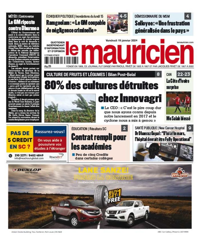 19 Jan 2024 08h20 Le Mauricin du 19 janvier 2023 Abonnement Le journal en continue Agaléga: un taux de réussite de 85,7% et des larmes de joie dans l’archipel 12 Déc 2025 19h00 Pensions : une hausse de 3,7 % pour plus de 325 000 bénéficiaires en janvier 2026 12 Déc 2025 17h15 Harcèlement en ligne : 1 414 incidents recensés officiellement depuis février 12 Déc 2025 17h00 Compensation Salariale : Rs 635 pour les salariés touchant jusqu’à Rs 50 000 12 Déc 2025 16h53 Lutte contre la drogue : 3 opérations et 14 kg de cannabis et de MDMA saisis en une journée 12 Déc 2025 16h00 Prison de Beau Bassin : Un détenu tente de se suicider 12 Déc 2025 15h00 Melrose – Meurtre à la prison de haute sécurité : La fouille au bloc Kestrel au cœur de l’enquête sur le cas d’Andy Selmour 12 Déc 2025 15h00 Réseau électrique: Coupures de courant programmées dans plusieurs régions du 12 au 14 décembre 12 Déc 2025 14h43 Loading... ACTUALITÉS Pensions : une hausse de 3,7 % pour plus de 325 000 bénéficiaires en janvier 2026 À partir du 1er janvier 2026, une hausse de 3,7 % sera appliquée à l’ensemble des pensions de base, incluant la pension de retraite,... 12 Déc 2025 17h15 Lutte contre la drogue : 3 opérations et 14 kg de cannabis et de MDMA saisis en une journée 12 Déc 2025 16h00 Agaléga: un taux de réussite de 85,7% et des larmes de joie dans l’archipel 12 Déc 2025 19h00 Harcèlement en ligne : 1 414 incidents recensés officiellement depuis février 12 Déc 2025 17h00 Pensions : une hausse de 3,7 % pour plus de 325 000 bénéficiaires en janvier 2026 À partir du 1er janvier 2026, une hausse de 3,7 % sera appliquée à l’ensemble des pensions de base, incluant la pension de retraite,... 12 Déc 2025 17h15 si vous l'avez raté Réseau électrique: Coupures de courant programmées dans plusieurs régions du 12 au 14 décembre 12 Déc 2025 14h43 Demande de Variation Order : Renganaden Padayachy essuie un deuxième refus de la Cour 12 Déc 2025 12h00 vidéos Disque de l’année : les artistes dénoncent une participation… sans aucun paiement 11 Déc 2025 07h00 [LIVE] Assemblée Nationale : la PNQ du jour axée sur les dépenses électorales de décembre 2024 9 Déc 2025 09h09 Reconfiguration de l’avenue Père Laval : un projet de Rs 10 millions officiellement ouvert aux automobilistes 3 Déc 2025 15h26 Rapport du PRB : Navin Ramgoolam ne peut avancer de date pour la publication 2 Déc 2025 12h33 [LIVE] PNQ : le rapport du PRB au cœur de la séance parlementaire de ce mardi 2 Déc 2025 10h16