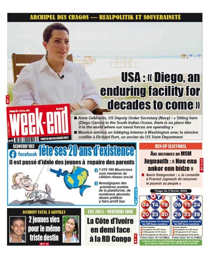 4 Fév 2024 06h00 Week-End du 4 février 2024 Abonnement Le journal en continue Agaléga: un taux de réussite de 85,7% et des larmes de joie dans l’archipel 12 Déc 2025 19h00 Pensions : une hausse de 3,7 % pour plus de 325 000 bénéficiaires en janvier 2026 12 Déc 2025 17h15 Harcèlement en ligne : 1 414 incidents recensés officiellement depuis février 12 Déc 2025 17h00 Compensation Salariale : Rs 635 pour les salariés touchant jusqu’à Rs 50 000 12 Déc 2025 16h53 Lutte contre la drogue : 3 opérations et 14 kg de cannabis et de MDMA saisis en une journée 12 Déc 2025 16h00 Prison de Beau Bassin : Un détenu tente de se suicider 12 Déc 2025 15h00 Melrose – Meurtre à la prison de haute sécurité : La fouille au bloc Kestrel au cœur de l’enquête sur le cas d’Andy Selmour 12 Déc 2025 15h00 Réseau électrique: Coupures de courant programmées dans plusieurs régions du 12 au 14 décembre 12 Déc 2025 14h43 Loading... ACTUALITÉS Pensions : une hausse de 3,7 % pour plus de 325 000 bénéficiaires en janvier 2026 À partir du 1er janvier 2026, une hausse de 3,7 % sera appliquée à l’ensemble des pensions de base, incluant la pension de retraite,... 12 Déc 2025 17h15 Lutte contre la drogue : 3 opérations et 14 kg de cannabis et de MDMA saisis en une journée 12 Déc 2025 16h00 Agaléga: un taux de réussite de 85,7% et des larmes de joie dans l’archipel 12 Déc 2025 19h00 Harcèlement en ligne : 1 414 incidents recensés officiellement depuis février 12 Déc 2025 17h00 Pensions : une hausse de 3,7 % pour plus de 325 000 bénéficiaires en janvier 2026 À partir du 1er janvier 2026, une hausse de 3,7 % sera appliquée à l’ensemble des pensions de base, incluant la pension de retraite,... 12 Déc 2025 17h15 si vous l'avez raté Réseau électrique: Coupures de courant programmées dans plusieurs régions du 12 au 14 décembre 12 Déc 2025 14h43 Demande de Variation Order : Renganaden Padayachy essuie un deuxième refus de la Cour 12 Déc 2025 12h00 vidéos Disque de l’année : les artistes dénoncent une participation… sans aucun paiement 11 Déc 2025 07h00 [LIVE] Assemblée Nationale : la PNQ du jour axée sur les dépenses électorales de décembre 2024 9 Déc 2025 09h09 Reconfiguration de l’avenue Père Laval : un projet de Rs 10 millions officiellement ouvert aux automobilistes 3 Déc 2025 15h26 Rapport du PRB : Navin Ramgoolam ne peut avancer de date pour la publication 2 Déc 2025 12h33 [LIVE] PNQ : le rapport du PRB au cœur de la séance parlementaire de ce mardi 2 Déc 2025 10h16